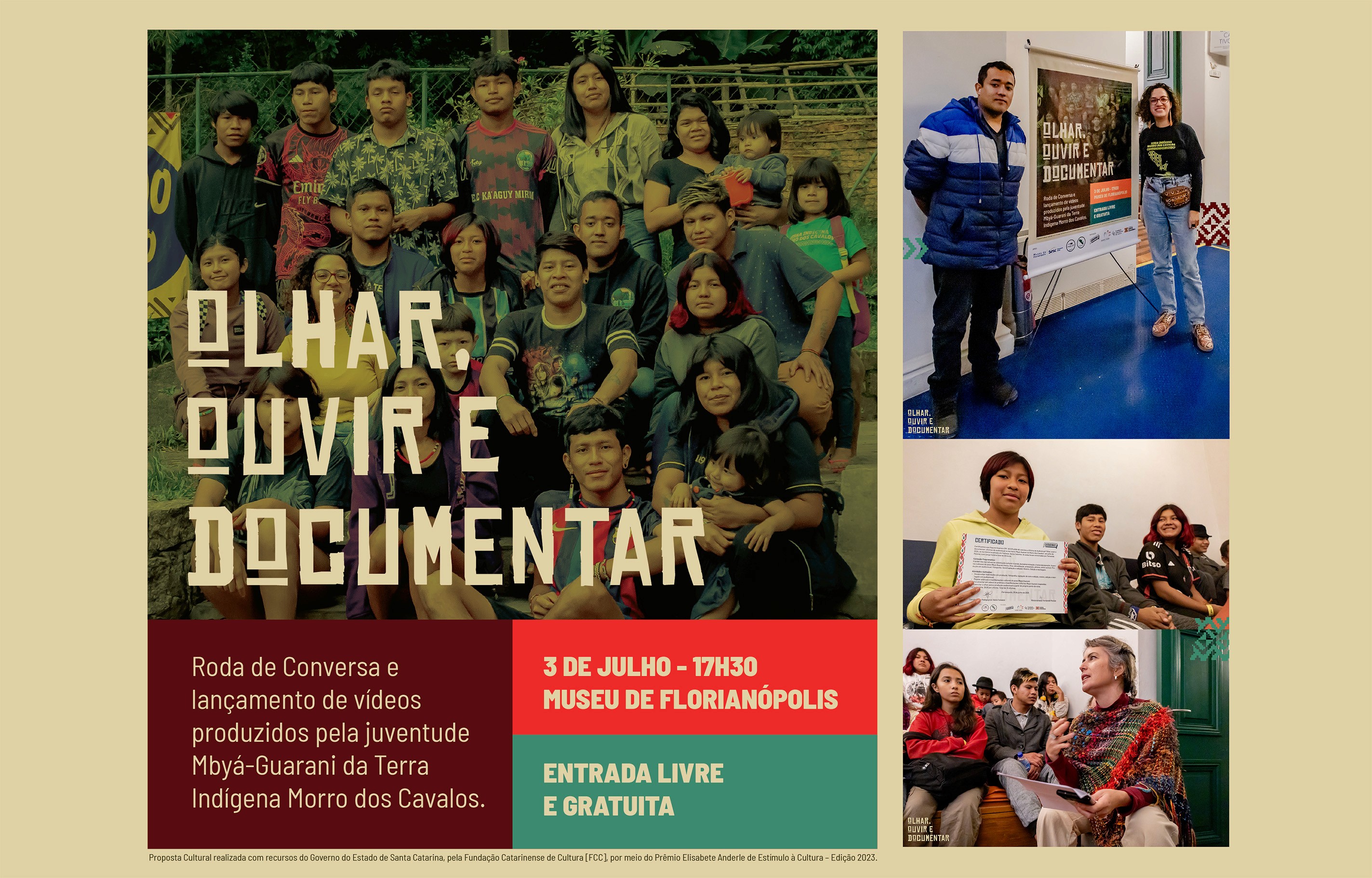 O projeto "Olhar, Ouvir e Documentar" foi realizado pelo Portal Catarinas com a comunidade Mbyá-Guarani do Morro dos Cavalos, em Palhoça (SC). Por meio de oficinas de produção audiovisual, capacitou jovens indígenas para narrar suas próprias histórias — seu território, sua cultura e sua luta pela homologação de terras. O projeto foi financiado pelo Prêmio Elisabete Anderle de Estímulo à Cultura, do Governo de Santa Catarina e da Fundação Catarinense de Cultura.